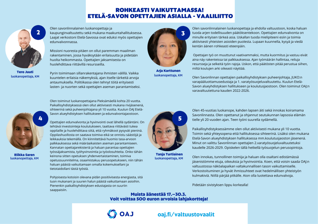 Tutustu ehdokkaisiin OAJ:n vaalikoneessa. https://www.oaj.fi/oaj/osallistu-toimintaan/oajn-valtuutettu/vaalikone/
